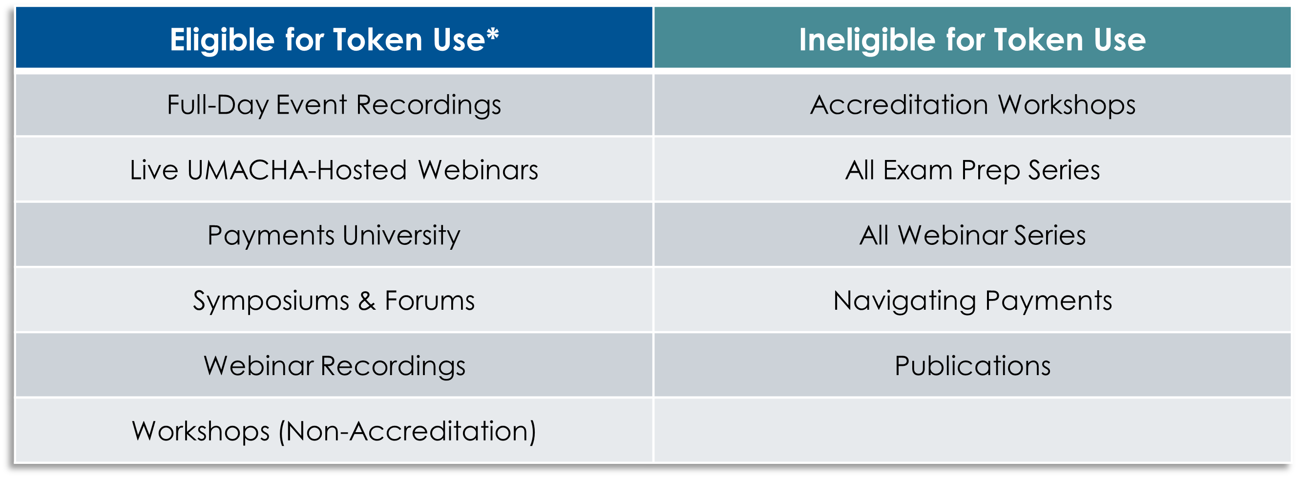 * Events not hosted solely by UMACHA may be ineligible for Education Club Token usage. The above table does not address all eligible & ineligible events. Please review the Details section for an event or recording to determine token eligibility.
